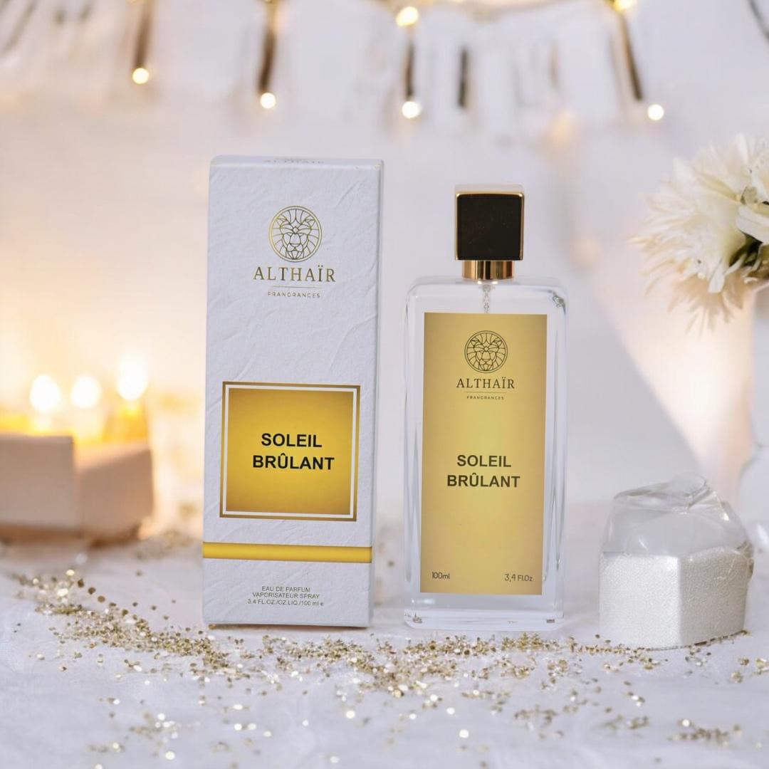 Laissez-vous envoûter par « Soleil Brûlant » d’Althaïr Fragrances, un parfum unisexe aux notes chaudes et sensuelles d’ambre, de miel et de fleurs blanches. Parfait pour les occasions spéciales.